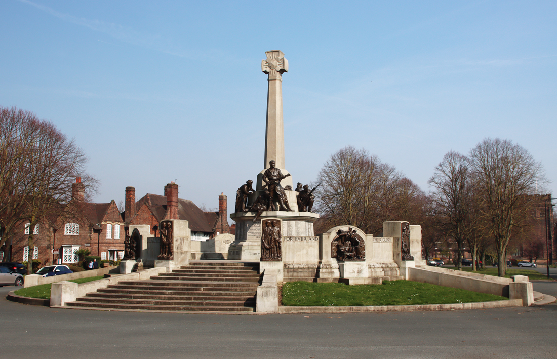 The war memorial is one of the unifying components of the village. Built between 1919 and 1921, and designed by Sir William Goscombe John, a friend of Lever’s, its theme was defence of the home. Inside the memorial is a copy of a book containing names of Port Sunlight residents and Lever Brothers employees worldwide who served in the forces during the First World War.