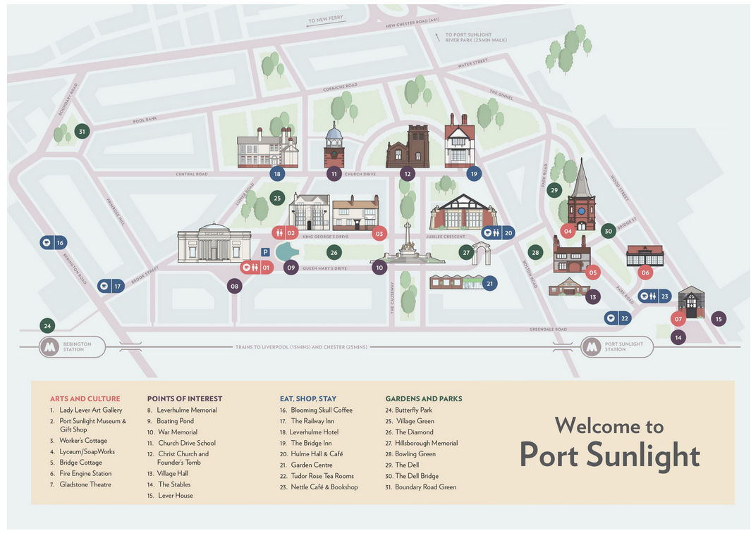 Tourist map of some of the main non-residential buildings of Port Sunlight. Source and full-sized version: Port Sunlight Village Trust
