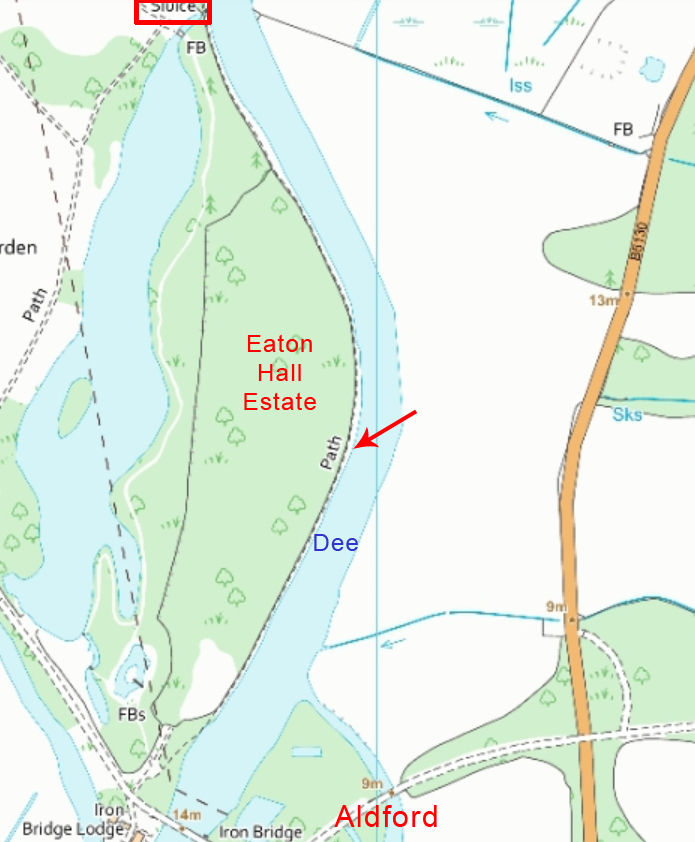 Map IronBridge to Sluice ← Previous Crossing the bridge from Aldford, follow signs right to walk northwards along the Dee along the side of the Eaton Hall estate. I turned back at the sluice, after about half an hour.
