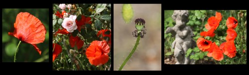 It has taken a long time to recover a rose bed full of mature rose bushes from giant holly trees and ground ivy but it is now looking beautiful, with two buddleias to provide additional colour and texture.  As I was pulling up some of the worst self-invited weedy offenders I recognized corn / common poppy leaves.  That bed had no poppies last year, meaning that these had blown in on the wind and settled down to establish themselves in amongst my roses.  Allowing poppies (Papaver rhoeas) to seed is always disastrous, because they spread like crazy and are so hard to remove in the long-term.  But I have a weakness for them and although I may be kicking myself this time next year, they are so glorious that right now I feel no regrets.  They are almost as tall as me, bright red with black centres, wending their way through the branches of a white rose.  This bed has been considerably disturbed in the last few years as we have restored it, and disturbed soil is a favoured habitat for the common poppy.  The effect is truly spectacular.  It has been used for medicinal uses throughout history in many cultures and is well known for its narcotic properties.