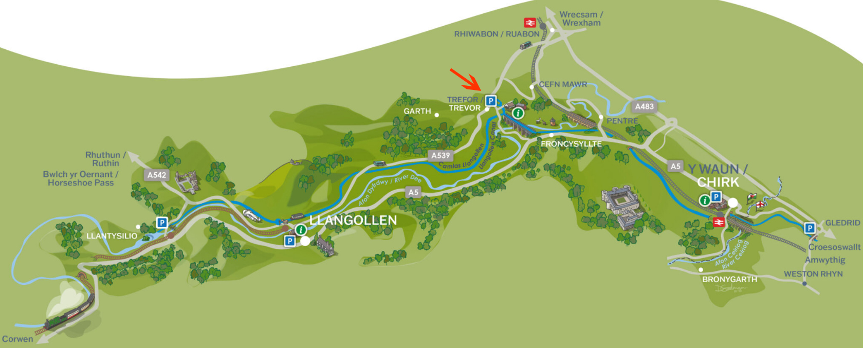 Pontcysyllte map ← Previous Map of the key canal features in the Vale of Llangollen. I have added a red arrow to show the best car park for Pontcysyllte. Click to enlarge. Source: Pontcysyllte Aqueduct & Canal World Heritage Site