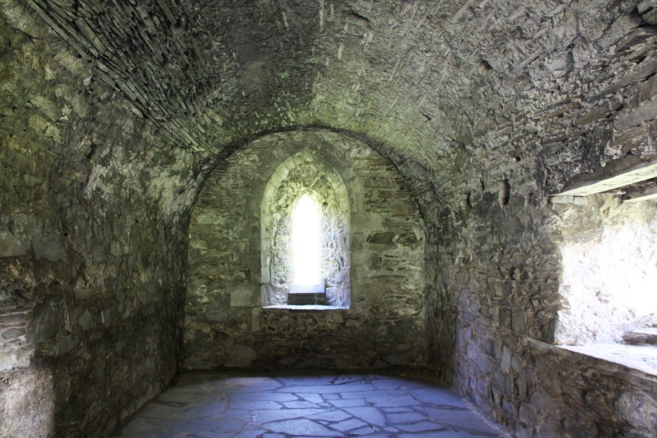 Sacristy ← Previous Next → The sacristy, looking east from the cloister end, with the church to the left