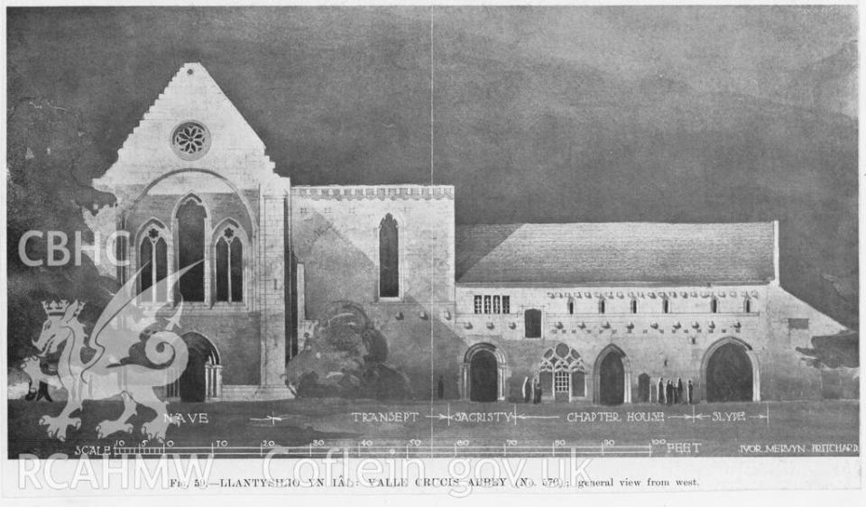 Valle Crucis illustration Coflein ← Previous Next → Ivor Mervyn Pritchard illustration showing elevation view of Valle Crucis. Source: Coflein