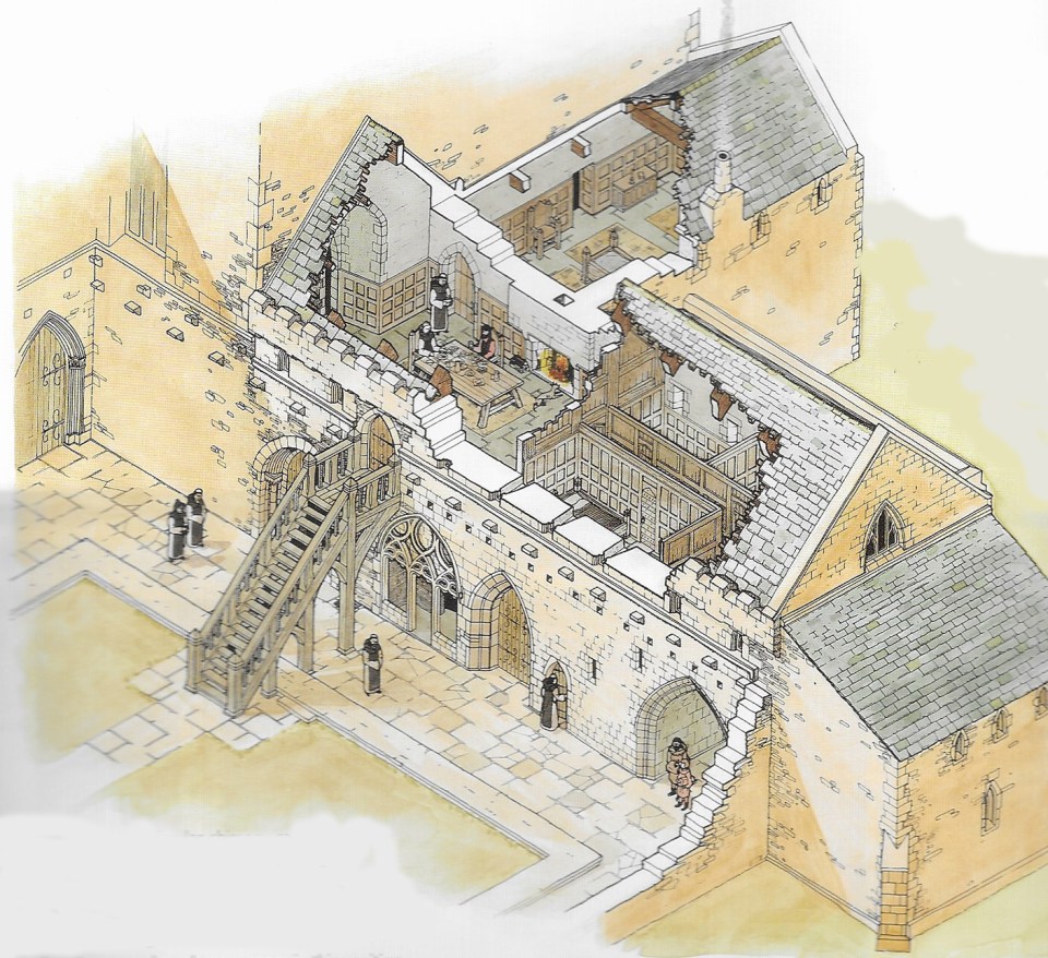 Valle Crucis early16thC ← Previous Next → In the early 16th Century the dormitory had been converted into a great hall for the abbot, and at least part of the arcade had been removed to allow a staircase to be added to the former dormitory. By Chris Jones-Jenkins. Source: Evans 2008