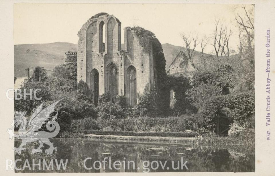Valle Crucis east face fish pond ← Previous Next → The east face of Valle Crucis. View from the other side of the monastic fish pond. Source: Coflein