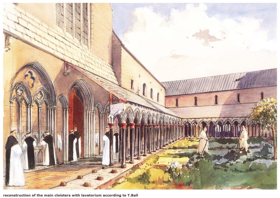 Tintern cloister and lavatorium ← Previous Next → Cloister and lavatorium of Tintern Abbey in south Wales. Reconstruction by T.Ball. Source: Medieval History