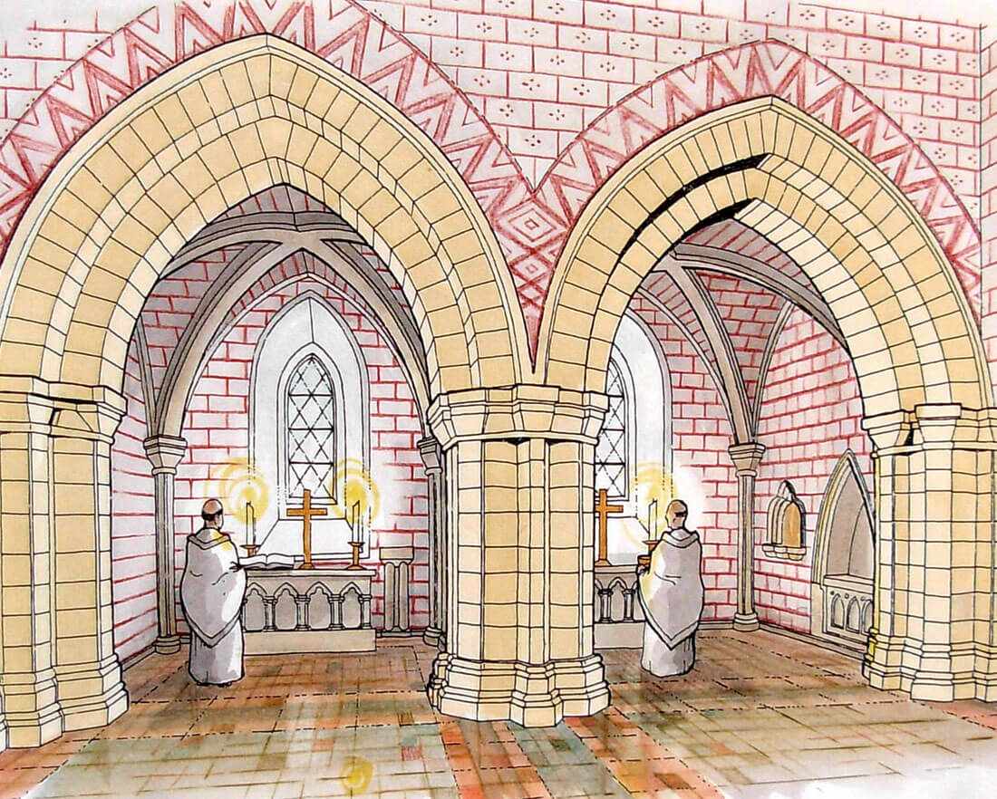 Valle-Crucis-Abbey-C_Jones_Jenkins ← Previous Next → Artist’s impression of one of the chapel pairs, each in one of the transepts. By C. Jones-Jenkins