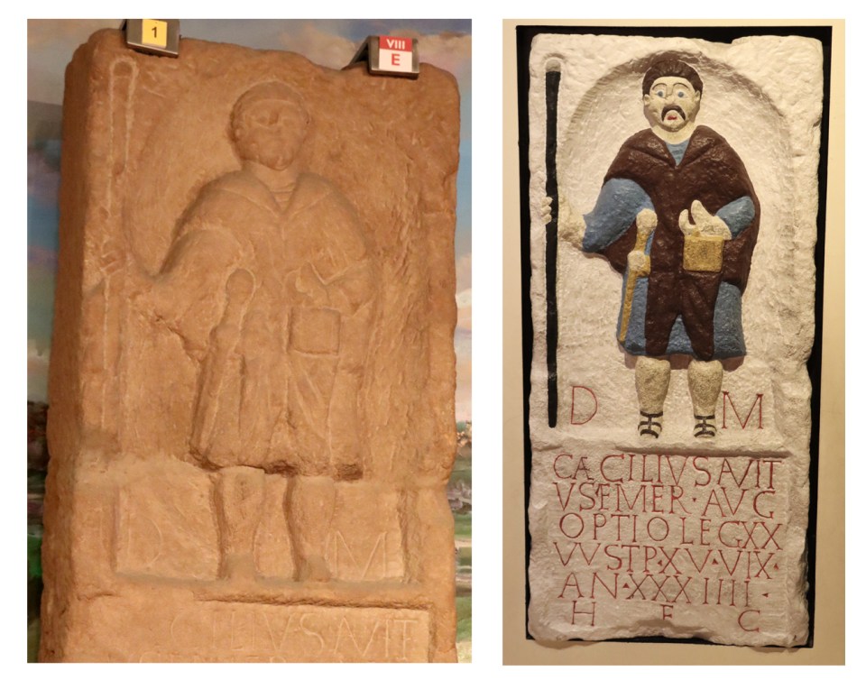Caecilius Avitus ← Previous Next → The tombstone of Caecilius Avitus, RIB 492. On the left is the original as it was found. On the right is the replica with its bright paint, both on display in the museum.
