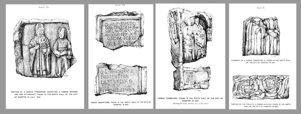 CAS composite ← Previous Next → 19th century illustrations from Chester Archaeological Society reports of the tombstones and other engraved stones excavated from the walls. Sources, left to right: