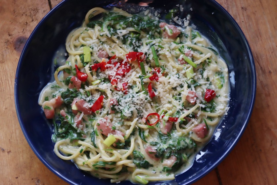 The same dish with wilted baby spinach leaves stirred in.