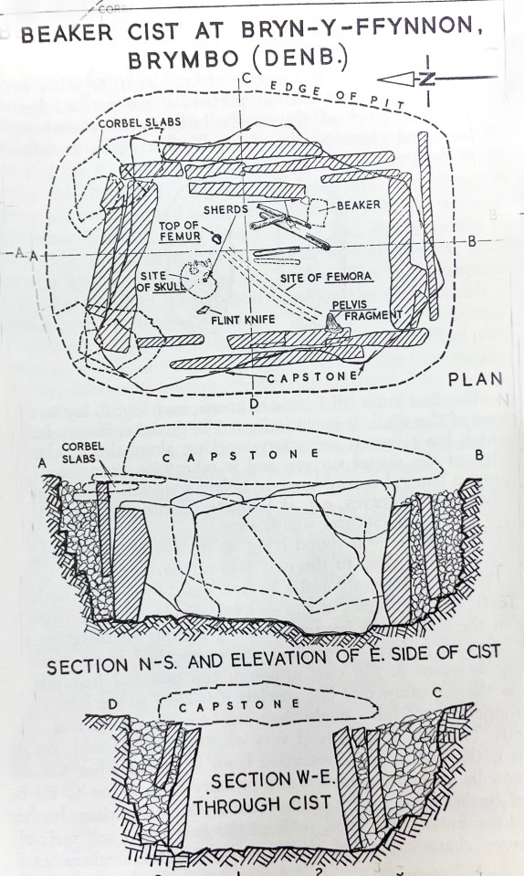 Brymbo site plan ← Previous Next → Savory’s 1959 illustration of the cist and capstone, showing the objects and skeletal remains in situ.