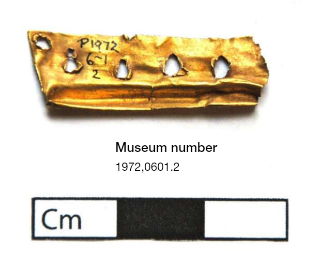 Mold gold piece with holes ← Previous Next → Gold piece with holes, probably to attach textile. Source: British Museum