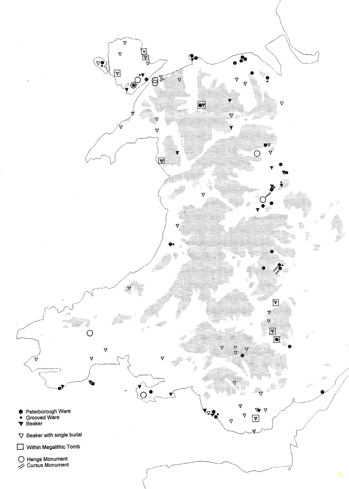 Beaker distribution Lynch 2000 ← Previous Next → Map of findspots of, amongst other things, Beaker burials, showing how they were largely confined to lowland positions in northeast Wales