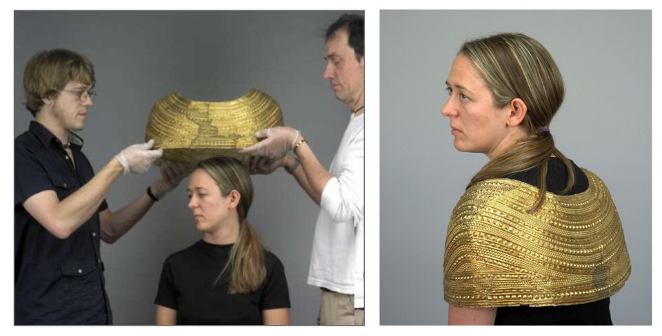 Mold Cape Woman Composite ← Previous Next → The cape being positioned on a woman to demonstrate how it would have looked on someone of her size, male or female. Source: British Museum