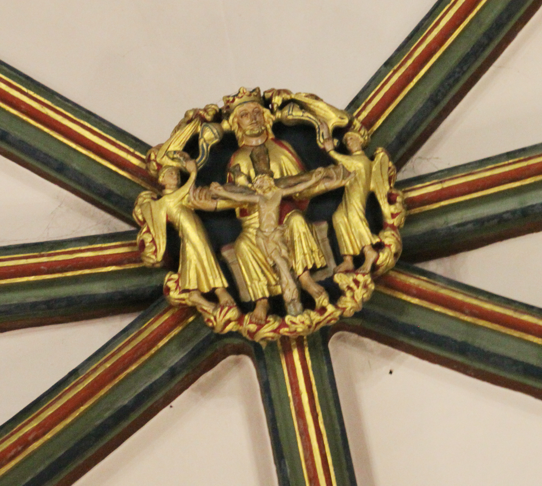 IMG_9308a ← Previous Next → The Holy Trinity, with God holding the arms of the crucifix in his hands The Virgin Mary with Jesus as a child