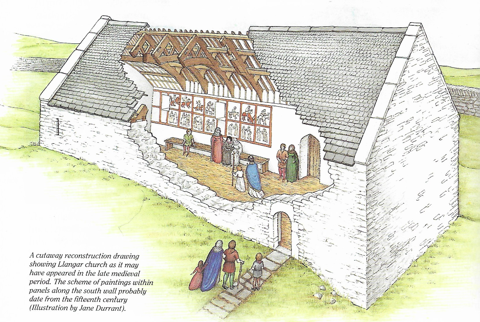Llangar scan Cadw Jane Durrant ← Previous Next → Cutaway reconstruction showing teh south wall panels as they may have looked in the 15th century. By Jane Durrant. Source: Cadw guide book by W. Nigel Yates (full details at end).