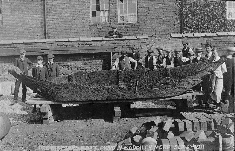 Logboat Baddiley Mere 1911 CheshCoCoun ← Previous Next → The Baddiley Mere boat at the time of its extraction in 1911. Source: The The North West England Regional Research Framework: Prehistoric Resource Assessment 2007