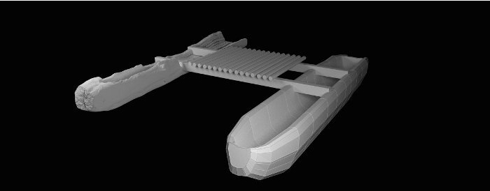 River Conon logboat arrangement ← Previous Next → Possible catamaran-style arrangement of two logboats suggested by the River Conon logboat. Source: AOC Archaeology Group