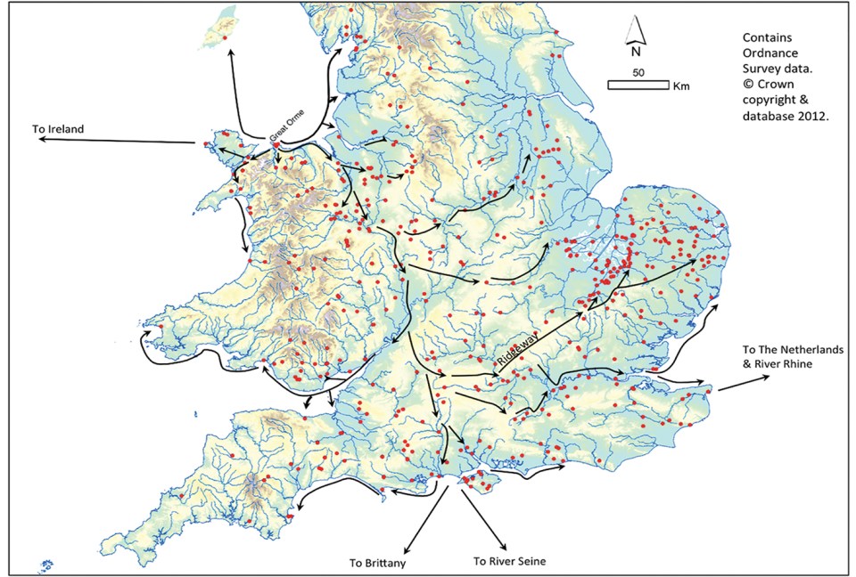 River routes patterned palstaves Williams ← Previous Next → River routes showing how patterned palstaves made of Great Orme ores may have been distributed throughout Britain. Source: Williams and de Verslud 2019