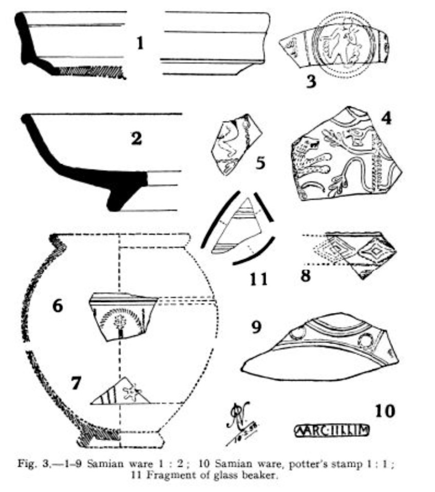 Presatyn Samian Newstead 1938 ← Previous Next → Samian pottery found at the Prestatyn site. Source: Newstead 1938