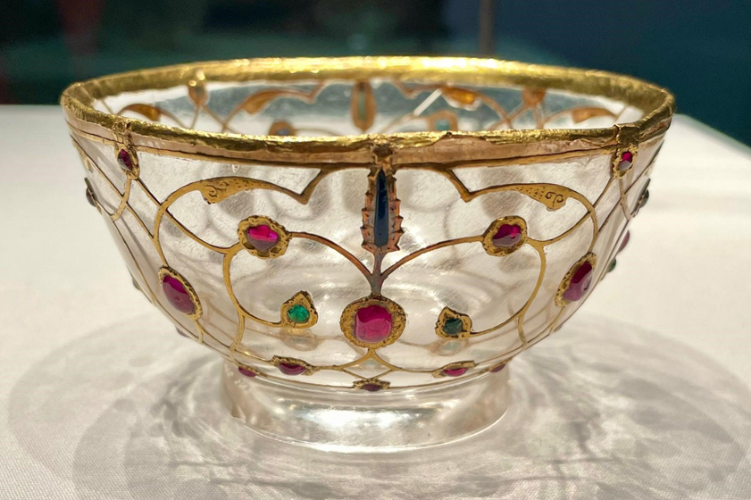 Rock crystal bowl ← Previous Next → Rock crystal bowl studded with precious gems and kingfisher feathers