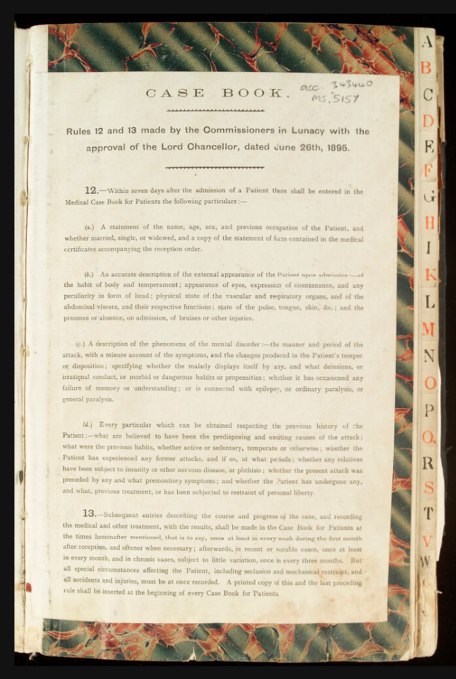 Holloway Sanatorium Hospital Medical Case Book ← Previous Next → Frontispiece of Case histories of patients of Holloway Sanatorium Hospital showing Rules 12 and 13 governing the conditions of entries in the Medical Case Book. Source: Wellcome Collection