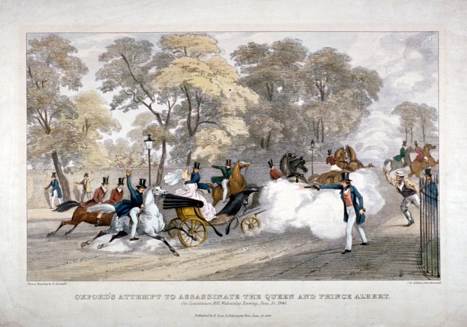JR_Jobbins_EdOxford_Attempt Queen_Victoria MeisterDrucke-1165305 ← Previous Next → Lithograph by JR Jobbins in 1840 showing the assassination attempt by Edward Oxford on Queen Victoria. Source: Meisterdrucke ()