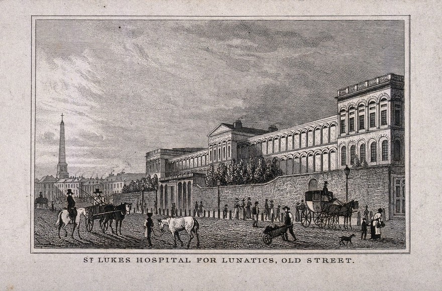 St Lukes Hosptial for Lunatics ← Previous Next → St Luke’s Hospital, Cripplegate, London: the facade from the east. Engraving after T. H. Shepherd. Source: Wellcome Collection, ref. 26120i
