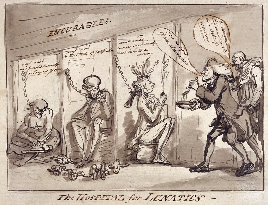 Thomas Rowlandsen 1989 cartoon Bethlem ← Previous Next → Bethlem Hospital, London: the incurables being inspected by a member of the medical staff, with the patients represented by political figures. Thomas Rowlandson 1789. Source: Wellcome Collection Ref 536228i
