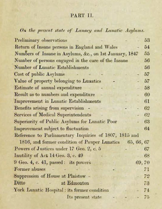 Further report of the Commissioners in Lunacy 1847 asylum ← Previous Next → Excerpt from the Table of Contents for the Further report of the Commissioners in Lunacy 1847
