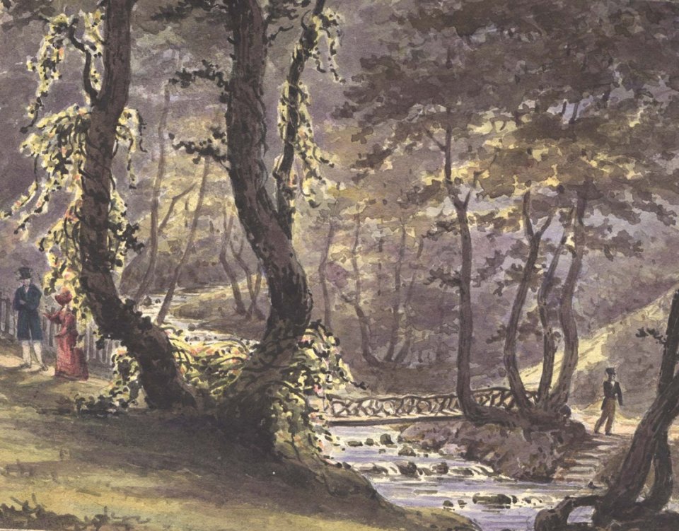 120577_Plas Newydd grounds with figures PeoplesCW ← Previous Next → View of the stream that runs along the valley next to Plas Newydd. Source: People’s Collection Wales