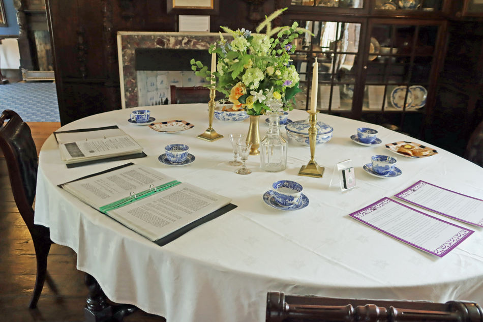 Plas Newydd ← Previous Next → Plas Newydd dining room, set up with loose-leaf folders and laminated pages in English and Welsh for visitors to read