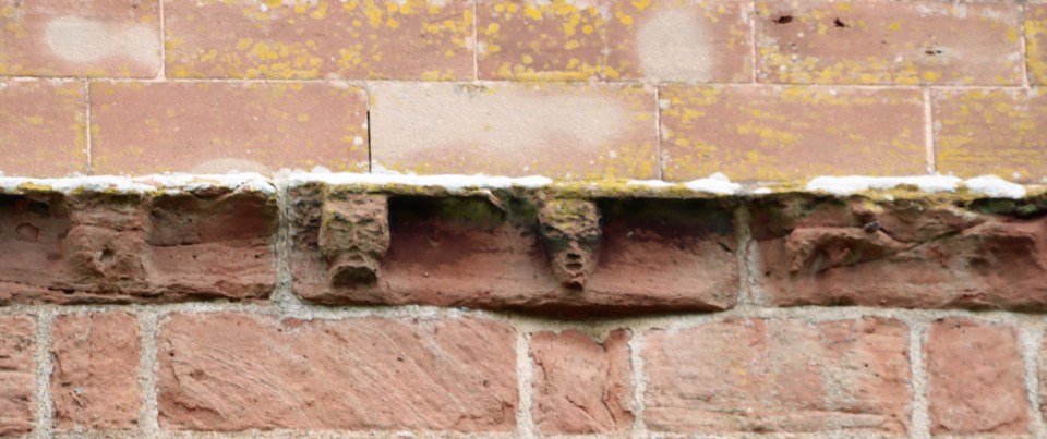 String course tower grotesques IMG_7450 ← Previous Next → The string course of grotesques, flowers and other motifs near the top of the tower.