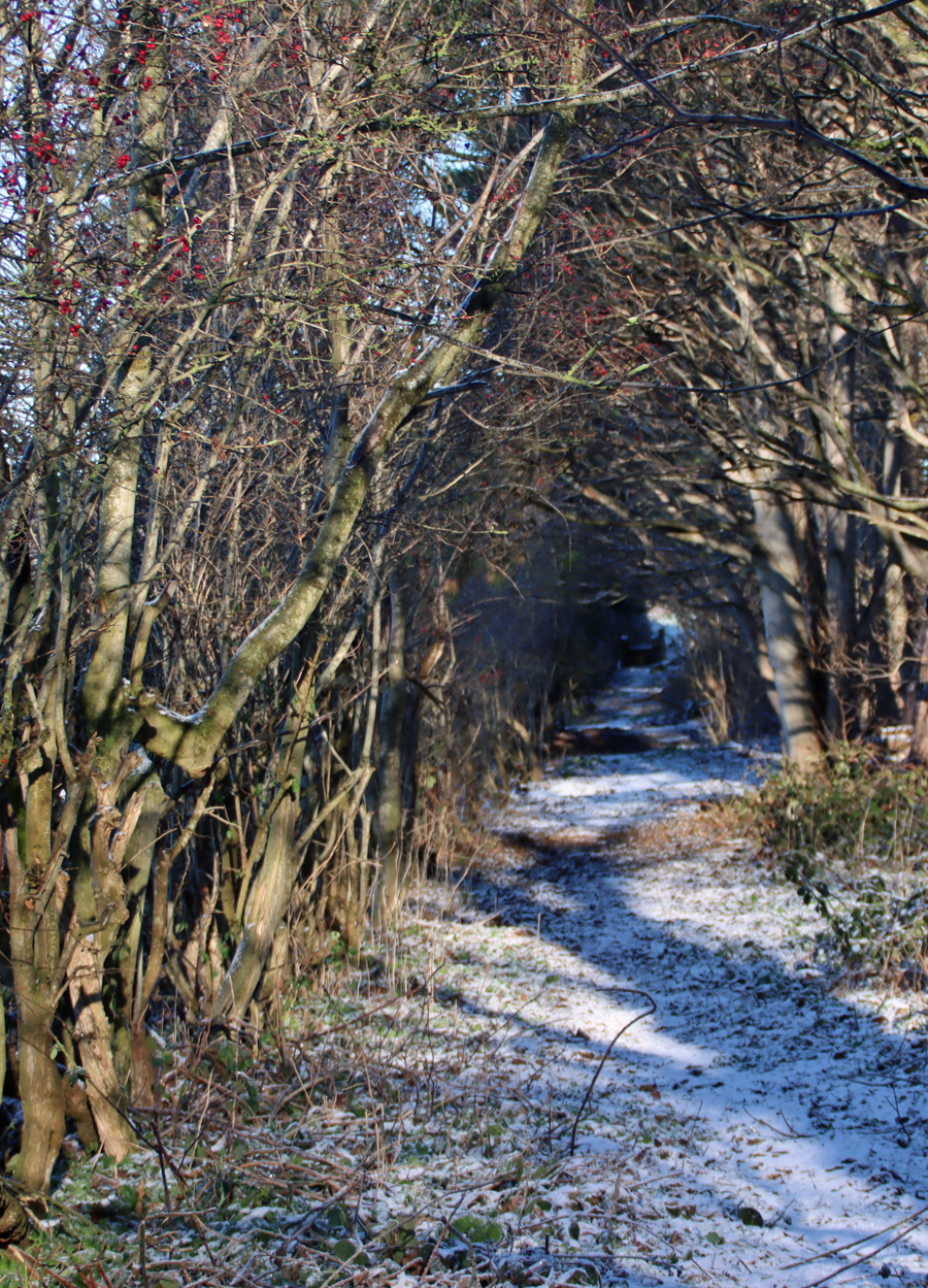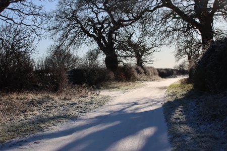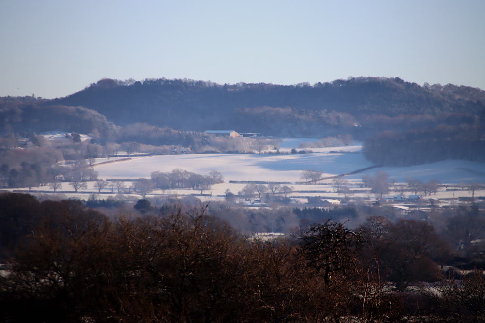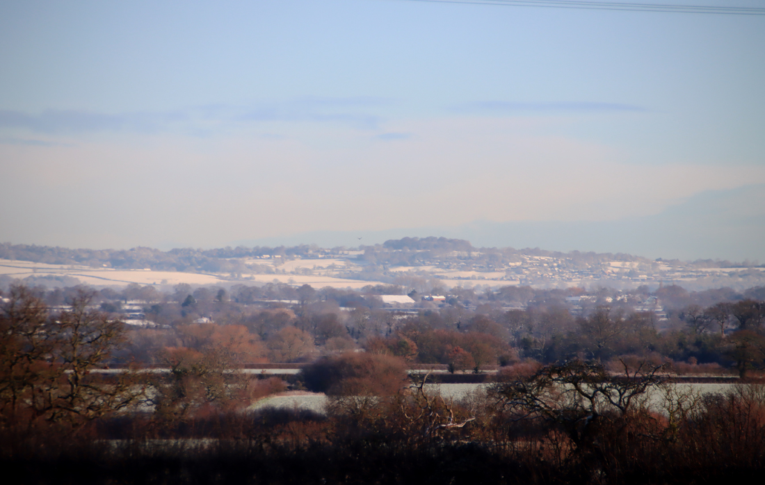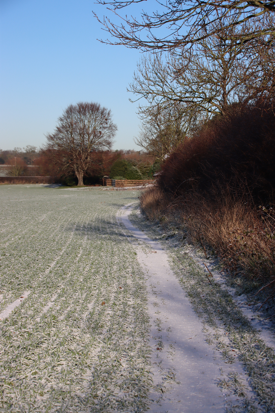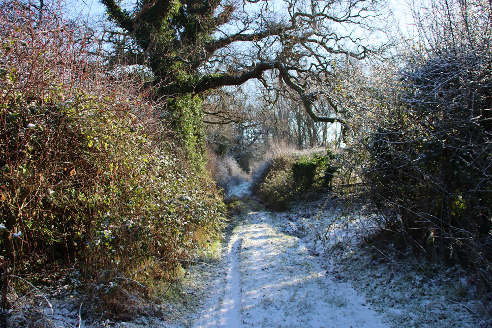 This is a pretty-pics post. It was a beautiful sunny January day today, after quite a lot of snowfall overnight. My garden was smothered in snow, and the car was fully shrouded. Even so, the sunshine was very warm and it was beginning to melt when I left the house at something past 11am, heading for Aldford and returning via the Roman Road (marked on the map at the end as Churton by Aldford FP9), making a good circuit. The views across the snow-covered fields to the hills to the east and west were lovely, but as always on these snowy walks, sometimes it is the close-up detail that is most lovely.