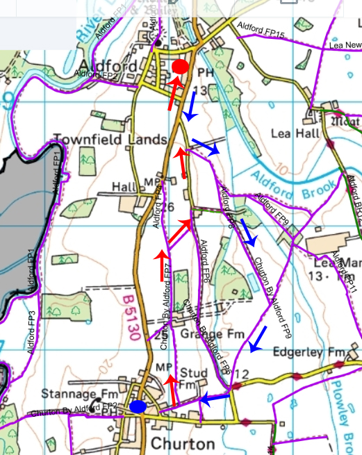 The route taken from Churton to Aldford (red arrows) and back (blue arrows). The red dot marks the Grosvenor Public House, and the blue dot marks the White Horse. Source of map: Cheshire West and Chester Public Map Viewer.