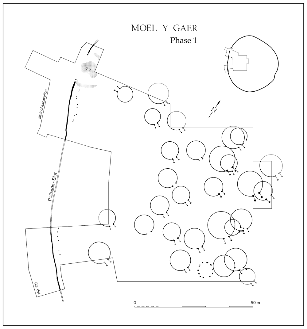 Section of the Iron Age hillfort Moel y Gaer Rhosesmor, on the Clwydian Range in northeast Wales, showing the orientation of roundhouses in Phase 1, with the majority of entrances with porches facing to the southeast. Although this orientation could be due to avoidance of prevailing winds, or to permit views across to the main hillfort entrance, it has been suggested that southeast roundhouse entrances may have allowed early morning entry of the sun into the house, moving around the interior to mark the passage of time throughout the day. Image source: Guilbert 2018