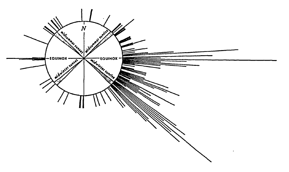 The orientation of Iron Age roundhouses, showing that the majority are orientated between the east and southeast. Source: Oswald 1997