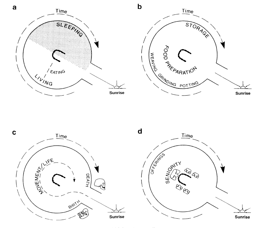 Alternative theories of roundhouse use by Parker Pearson and Sharpies 1999: “Interpretations of the use of space in British Iron Age roundhouses: (a) Fitzpatrick’s sunwise scheme (Fitzpatrick 1994); (b) an extension of Fitzpatrick’s scheme in the light of wheelhouse layout; (c) the sunwise pattern of movement within the house, including the metaphor of the human life cycle round the house; (d) the organization of seniority around the central hearth).” Source: Parker Pearson and Sharpies 1999, image drawn by Adrian Chadwick)