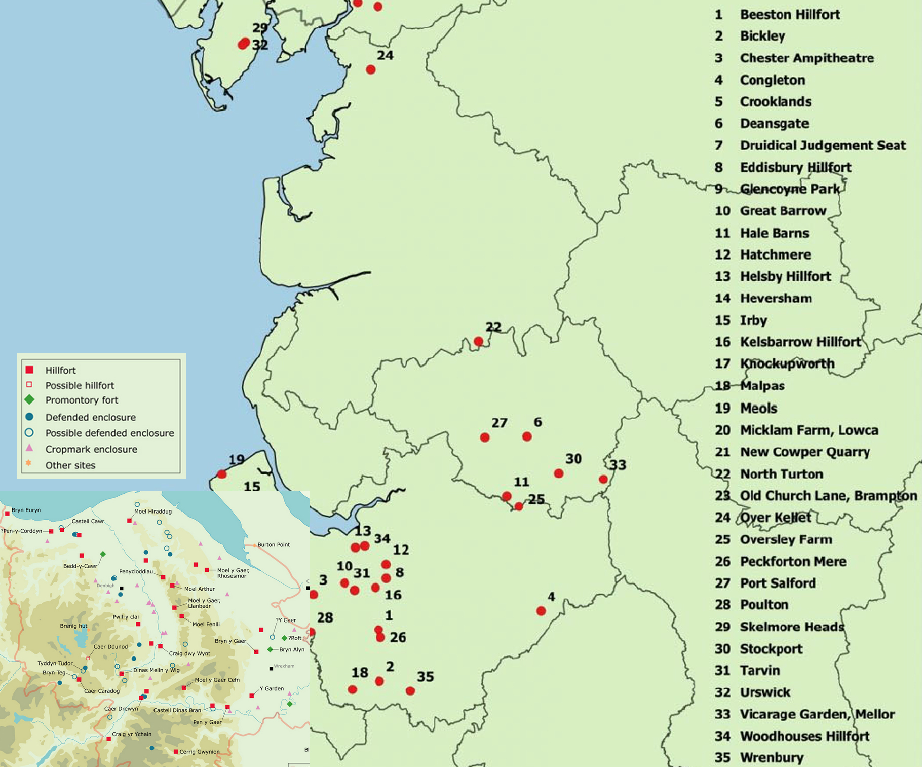 There is good circumstantial evidence to suggest an Iron Age date for the Burton area.  Burton Point was also well positioned for visual communication with contemporary sites, as discussed by David Matthews in 2006 and Erin Lloyd Jones  in 2019.  A 2011 experiment, the Hilltop Glow event, organized by the former Heather and Hillforts project, demonstrated that Burton Point and reported on the BBC (BBC News March 2011) was one of ten Iron Age hillfort sites (on the Clwydian Range, Halkyn Mountain, the mid-Cheshire Sandstone Ridge, and at Burton Point) that determined which sites could be seen from one another when torches were lit.  The BBC report of the experiment quoted Heather and Hilltops representative Erin Robinson, stating that Burton Point was visible as far away as Maiden Castle at Bickerton Hill, 25km /15.5 miles (shown above), as well as nearer sites on the Clwydian Range.  Burton Point would also have been in the proximity of Iron Age sites 129 and 154  at Puddington Lane in nearby Burton Village, which confirm that a later Bronze Age and Iron Age presence were in this area.  By boat, Iron Age settlements in both Chester and Meols would have been within easy reach:  Iron Age settlement features were found during the excavations of the Roman amphitheatre in Chester; and at Meols a number of Iron Age finds, including coins, have lead to suggestions that Meols may have been a trading port with connections to both north and south along the coast at that time.
