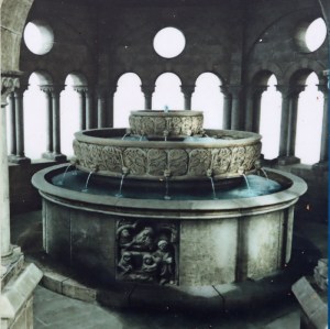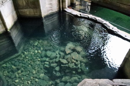 St Winefride’s well is built over the point at which an ancient spring, an underground stream, erupted to the surface, producing a quite dramatic spectacle of fiercely rushing water, particularly after rainfall. That was not the same spring that is seen today.