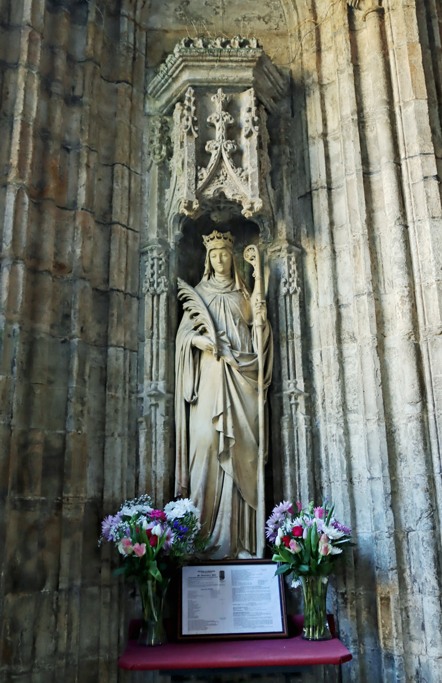Statue of St Winefride within the lower chapel. The niche with its elaborate and intricate canopy is original, but the medieval statue was lost, and this dates to 1886