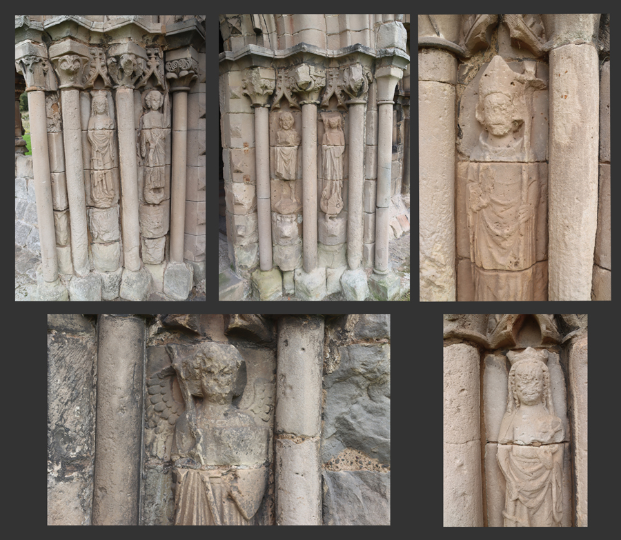 The remains of the later 14th century shrine to St Winefride, Shrewsbury Abbey showing St John the Baptist at left, St Beuno at right and Winefride in the middle.