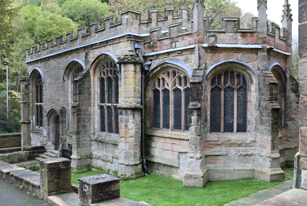 View of the chapel from the south. The chapel is over two floor. The fan-vaulted ground floor has three bays, with the central one containing the well itself. The upper chapel is fully enclosed and its entrance is on the same level as the entrance of the parish church.