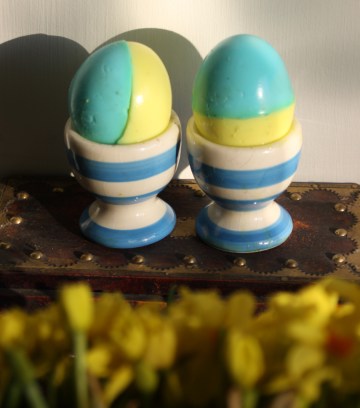 In central and eastern Europe, real hard-boiled eggs continue to be an important part of the celebration, usually painted with traditional decorative themes, like the ones right. At the outbreak of the Russian war on Ukraine I wrote a short post about a traditional Ukrainian egg recipe (divine – фаршировані яйця). The egg cavity was stuffed with the yolk mashed up with mayonnaise, sour cream, as well as finely chopped chives or spring onions, and the whole lot was topped with a low-cost version of caviar and served on a bed of ramsons (wild garlic leaves), which you can find here. I finished up that post talking about my not entirely successful attempt at dying eggs in the blue and yellow colours of the Ukrainian flag (below).