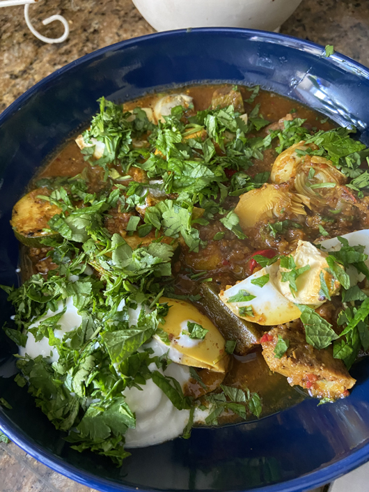 Sliced eggs on crushed avocado with lovage – and a Pimms – last summer. It was enormous, seriously over-ambitious, and I abandoned my plans for a proper evening meal!