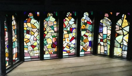 Winefrede and Beuno in the modern stained glass in the little prayer chapel for worshippers today, next to the main chapels. The palm represents the spiritual victory of martyrdom, whilst the crozier (staff) symbolizes teaching, wisdom and guidance.