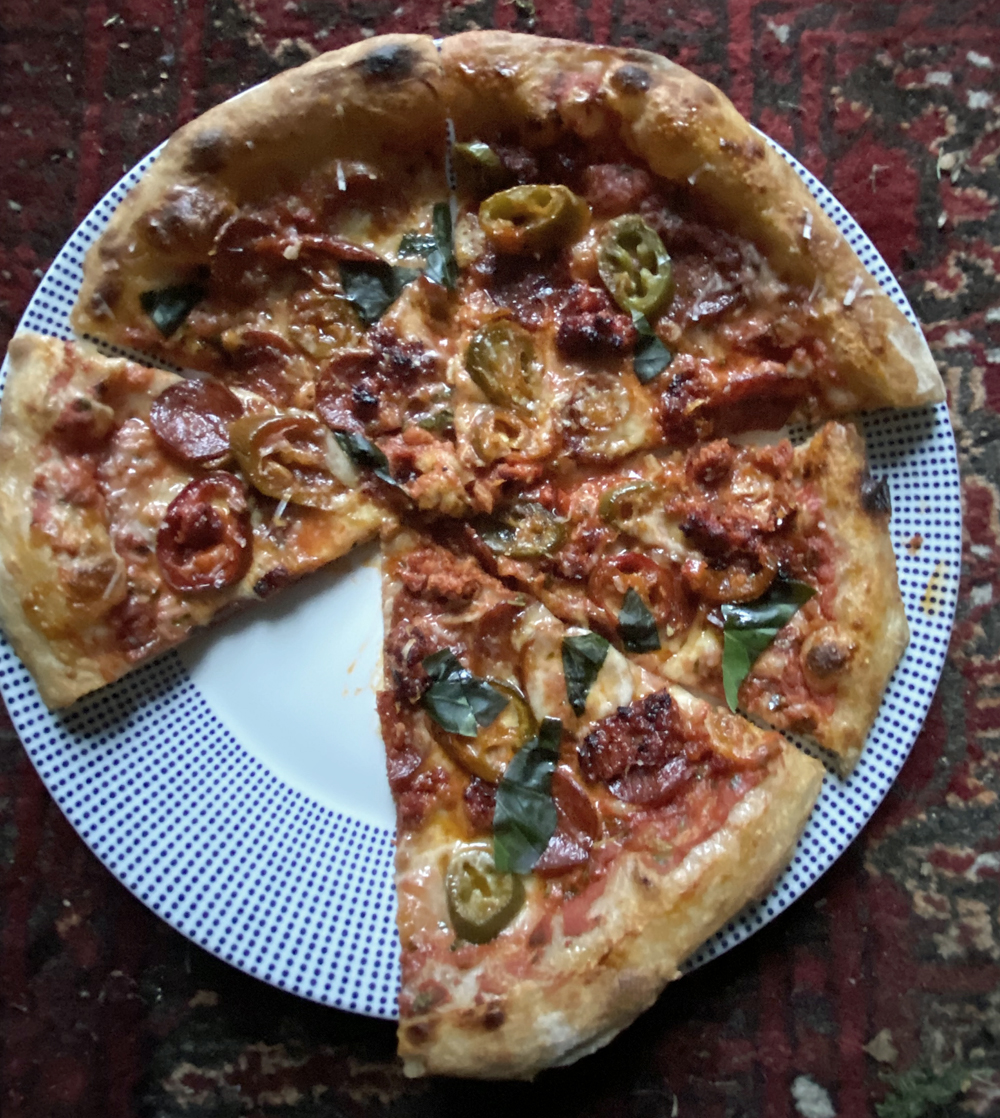 I first noticed it on Friday two weeks ago when I passed the garage entrance on my way home, a little way up from the post office/pharmacy in Farndon as you head north on Churton Road towards Chester. To my surprise the garage entrance was wide open, filled with light, and there was a busy pizza-making operation in full swing. I immediately abandoned my plans for making a fiddly cheese soufflé, ditched the car, and entered a nirvana of bright music, a chatty, friendly atmosphere and the most gorgeous aromas emanating in my direction. Fifteen minutes later I walked out with an exciting pink and black pizza box, the proud possessor of a Penduja Power. Oh the bliss! I could barely wait to get home to lift the lid as the aromas began to do serious injury to my will-power. The Penduja, with a crispy crust, thin base, chunky slices of jalapeño and thickly spread nduja, has a serious kick to it, with smokiness from the pepperoni, whilst both the creamy fior di latte mozzarella and pure mozzarella ensure that there is just the right balance of flavour, with subtle undertones and divine ultra-spicy overtones, all accompanied by gorgeous hits of fresh basil. It really was love at first glorious bite ❤️.
