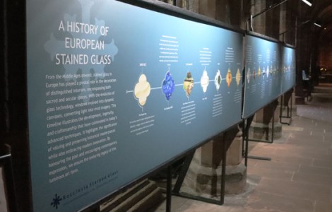 The creation of stained glass is probably one of the most poorly understood areas of art, craft and design. Although it is widespread, and not only in religious buildings, its history and the processes of manufacture and repair are something of a mystery for most of us. The process of demystification has been very much assisted by an enormous but easily digested set of information boards that lead down one part of the cloister, charting the chronological history of the artistic and technical advances in stained glass development. It’s a real revelation and is beautifully written and designed.
