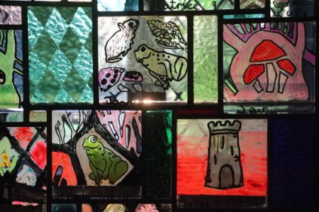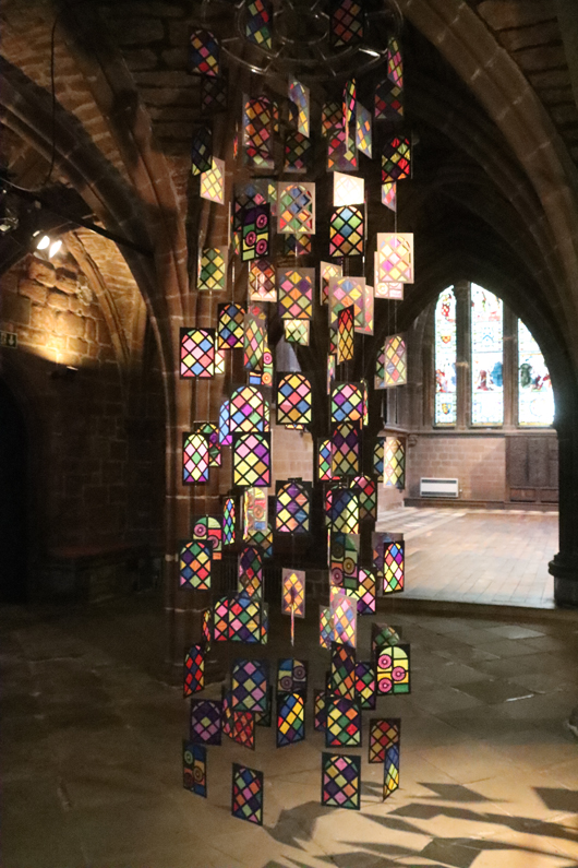 One of the really creative parts of the exhibition, and an admirable requirement for a part of the funding for the exhibition, was that the local community should be given the opportunity to respond to Trena Cox’s stained glass art with art works of its own. I knew about this when I visited the Trena Cox windows with the Chester Archaeological Society, lead by Aleta, but was not at all clear about how this part of the project would manifest itself. What a super surprise to see the inventiveness and imagination produced by local community groups and schools! Here are some examples: