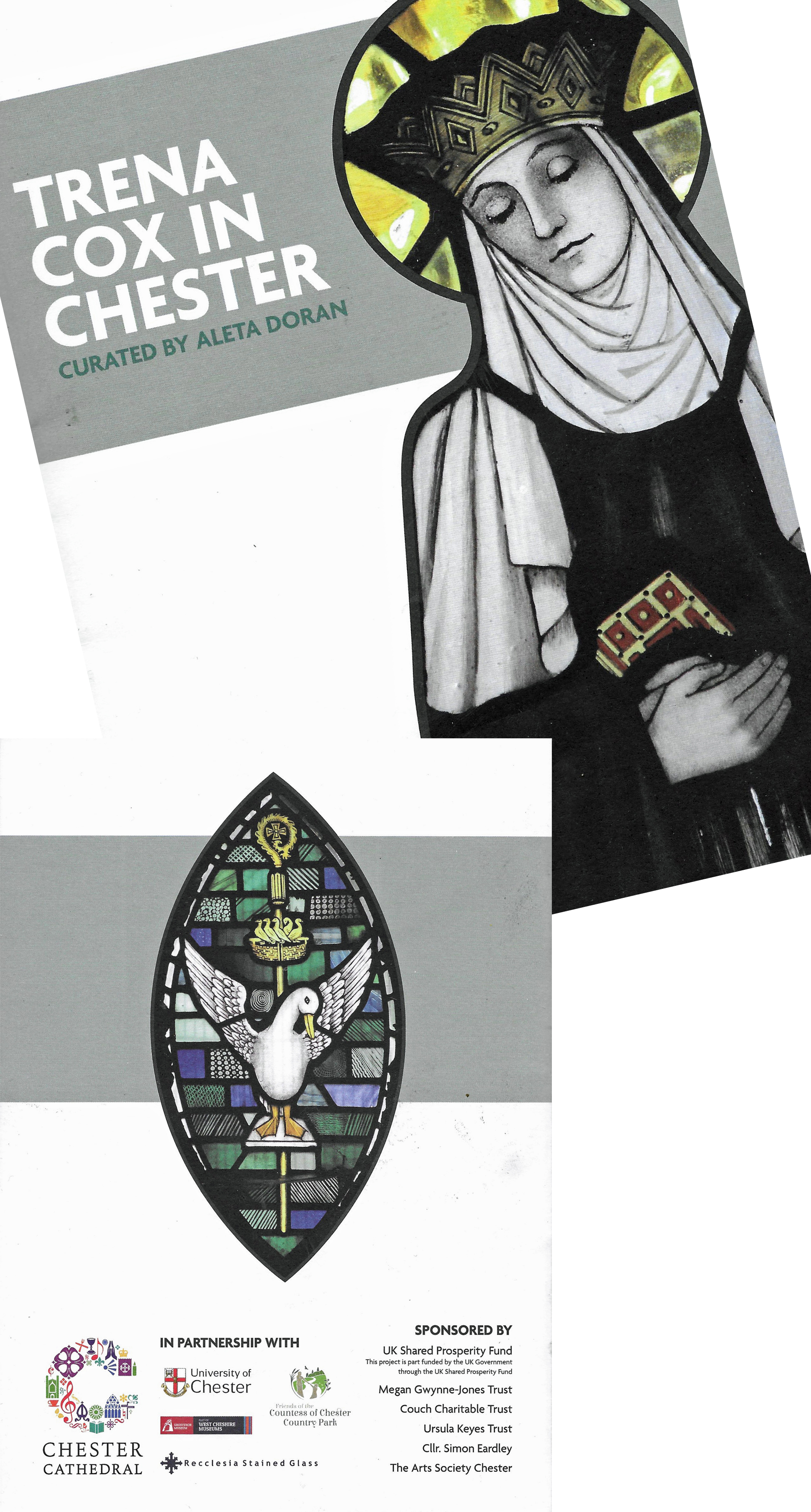 Born on the Wirral, Trena Cox trained at the Laird School of Art in Birkenhead, receiving a traditional introduction to a broad range of techniques and skills before switching to stained glass. There are over 150 stained glass pieces known, but others may remain to be found. Working mainly in the Cheshire and northeast Wales areas, her works are, however, in other areas, and most of them are in churches. Trena’s story, which has sometimes been a challenge for Aleta to discover, emerges from both the posters and the audio track and demonstrates not only Trena’s talent but her willingness to modify her style to suit the times.